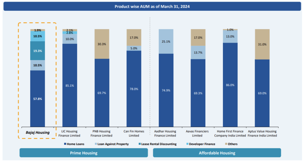 BHFL stands out as the most diverse housing finance company in India. While home loans contribute significantly to its revenue, BHFL is less reliant on them compared to its peers. The company’s portfolio is well-balanced across various products, reducing dependency on any single offering. This diversification provides strong protection against downturns in any specific product line.