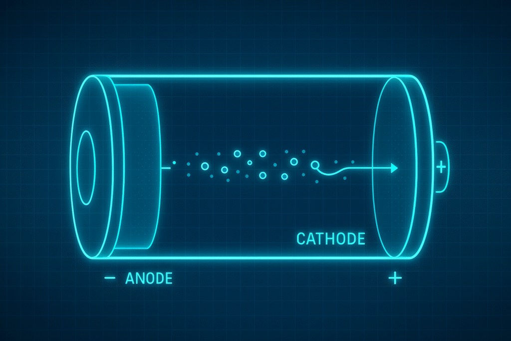 Every battery has three main parts: Anode (–), Cathode (+), and an Electrolyte in between. When you power a device, a chemical reaction pushes electrons from the anode to the cathode; that’s electricity. Once the chemicals are used up, the battery stops working until it’s recharged.
