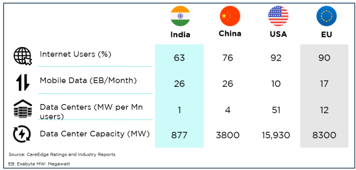 While the internet usage as well as data center capacity has increased in the last two and a half decade, India is still very behind compared to its global counterparts.
