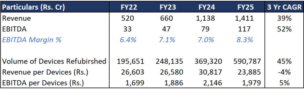 GNG’s financial trajectory in recent years mirrors its operational story of rapid scaling. The company has been on a steep growth curve, outpacing the industry by a wide margin. From FY22 to FY25, GNG’s revenue from operations surged from Rs. 520 Cr to Rs. 1,411 Cr, CAGR of 39**%**, even as the global refurbished electronics market grew at about 10.7%.