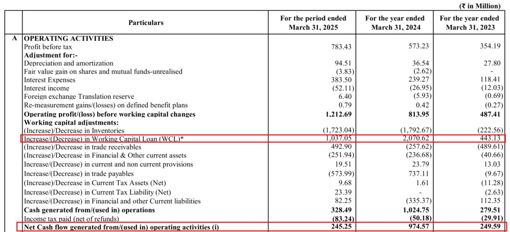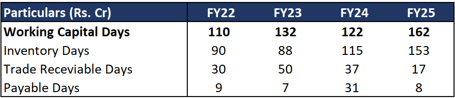 Once you adjust for the short-term loan inflows, the picture flips, GNG is actually running a negative CFO and relying on external funding (debt and equity) to keep operations going. A large chunk of this IPO is essentially aimed at repaying its working capital loans. That’s not surprising, given it operates in an extremely working capital-intensive business, with inventory sitting idle for over 3–4 months at a time.