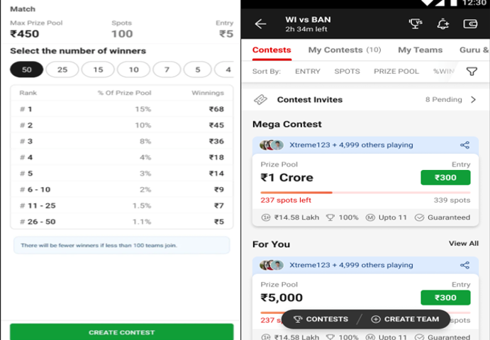 (Source: Dream11, Left – Private Contest & Right – Public Contest)
