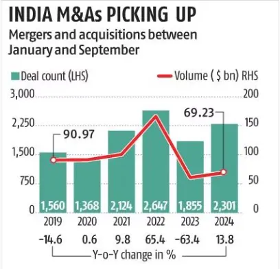 From January to September, M&A activities in India reached $69.2 Bn, marking a 14% increase compared to $60.8 Bn during the same period last year. This growth comes after a year of decline in M&A activities, highlighting a resurgence in the market.
