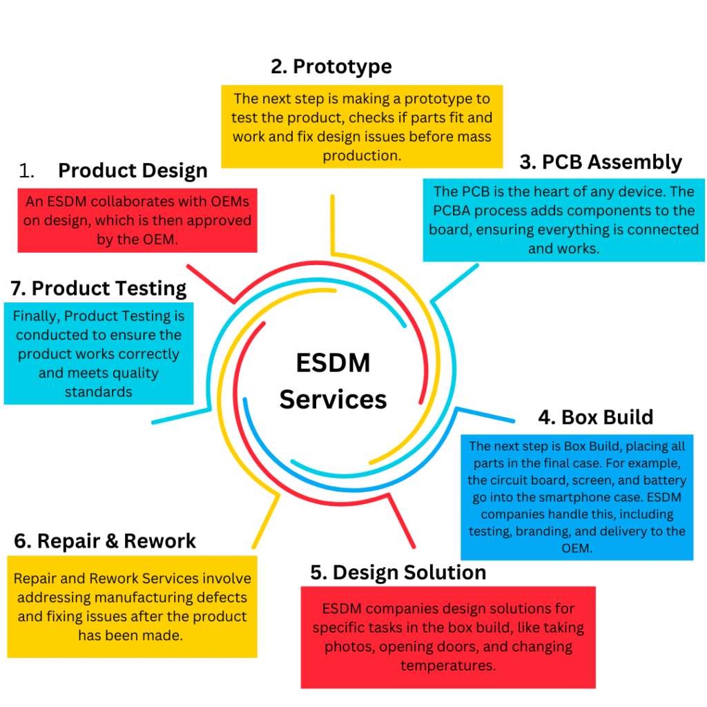 Let’s take a smartphone as an example. When a smartphone company wants to launch a new device, they don’t just design it and start manufacturing right away. Instead, they team up with an ESDM company. Together, they design the product. Once the design is ready, the ESDM company takes over the manufacturing. The smartphone company then focuses on marketing and selling the final product to you, the consumer.