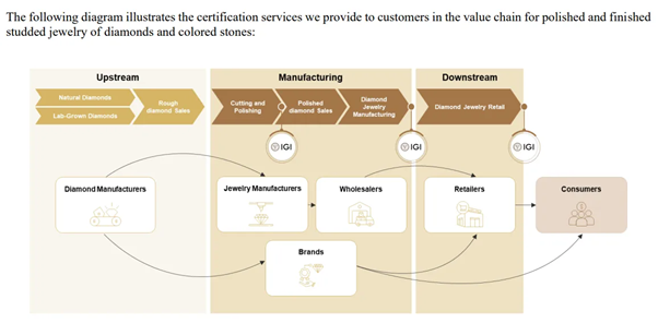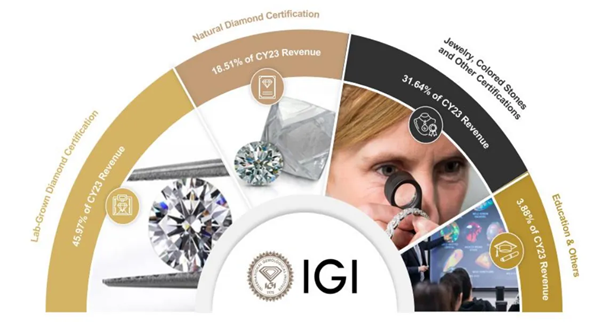 – IGI operates mainly as a B2B business with a global customer base of 7,500 clients across 10 countries, including lab-grown diamond producers, natural diamond and colored stone wholesalers, jewelry manufacturers, and retailers. In 2023, IGI ranked as the second-largest independent certification provider worldwide for diamonds, studded jewelry, and colored stones.