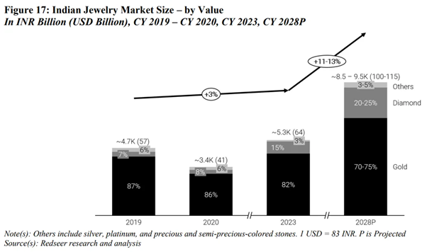 Gold has always been the biggest part of India’s jewelry market, contributing ~87% in 2019. Going forward, the share of gold jewelry is expected to drop to 70-75% by 2028. On the other hand, diamond-studded jewelry has been growing fast—it went from 7% in 2019 to 15% (~Rs. 780 Bn or $9 Bn) in 2023. Thanks to rising incomes, changing tastes, more working women, increasing demand for diamonds in weddings, and affordable LGDs, this segment is expected to grow at a 20% CAGR expecting to contribute 20-25% of the market by 2028.