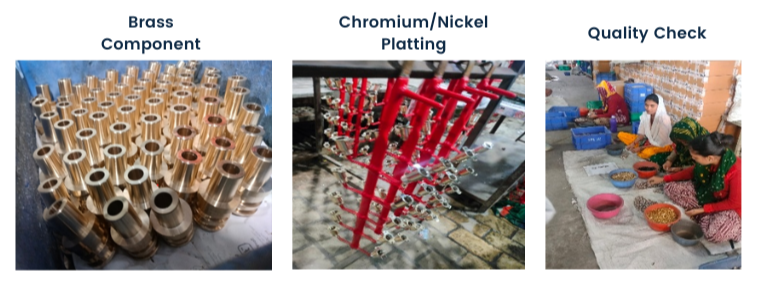 The way sanitary giants like CERA and Jaguar meet their brass component needs is that they manufacture a small proportion in-house by setting up their own plants, sourcing ingots, billets, and rods from Jamnagar recyclers. For major additional requirements, they directly purchase components from Jamnagar manufacturers.