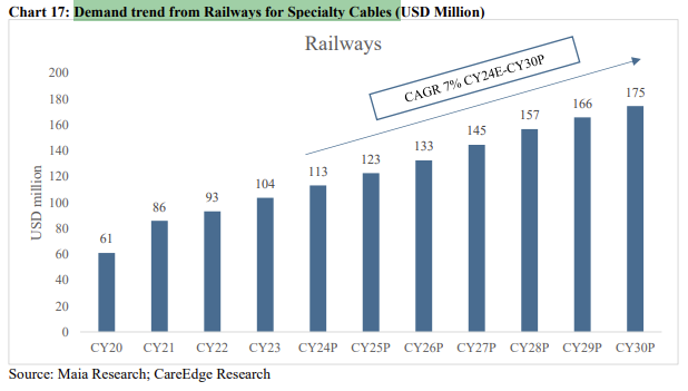 The Indian specialty power cable industry, which includes Quadrant’s operations, is projected to grow at a CAGR of ~10% between 2024-2030, driven by growth in renewable energy projects, upgrades in transmission networks, and expansion in the railway sector.