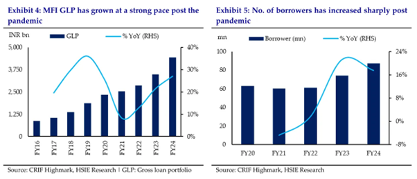 The microfinance industry in India has expanded significantly, growing at an average annual rate of about 23% from FY17 to FY24. This growth has been fueled by a steady increase in new borrowers, which grew by ~10% annually, and a rise in the average loan amount, which increased by ~11% each year.
