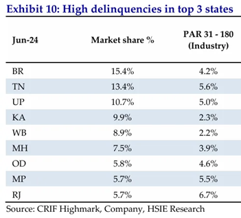 The high delinquency rates are significantly impacted by states with the highest credit penetration. Bihar has over 80% penetration, while Karnataka and Tamil Nadu have more than 57% and 53%, respectively.