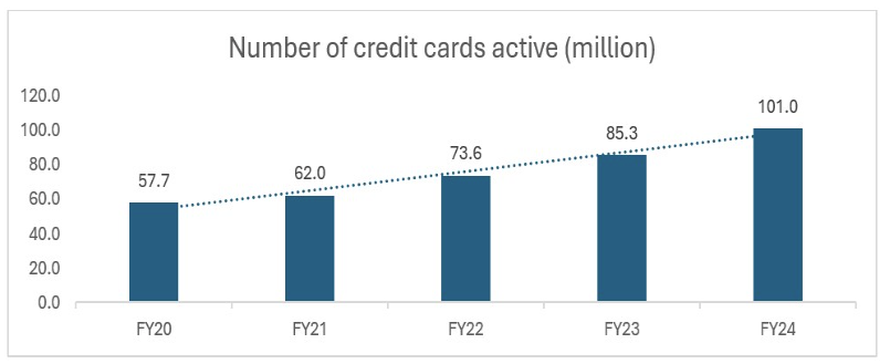 India has seen a remarkable rise in credit card adoption over the past decade. In 2011, credit cards were scarce, with fewer than 2 crore active cards. However, between 2019 and 2023, the market experienced rapid growth, increasing from 5.5 crore cards in December 2019 to nearly 10 crore by January 2024, and surpassing 10 crore by February 2024. This surge was fueled by reduced entry barriers, diverse co-branded offerings, and the convenience, rewards, and credit score benefits that credit cards offer. The utility of credit cards was further enhanced by the RBI allowing RuPay credit cards to be linked with UPI, making them even more appealing to consumers.