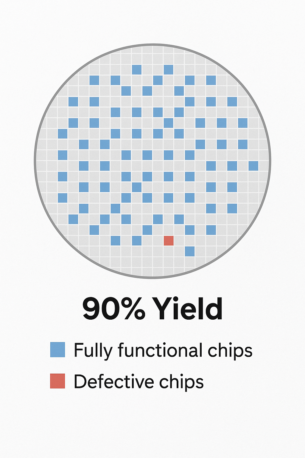 Yield – To understand how chips are made, picture a wafer, a thin, round slice of pure silicon. On each wafer, hundreds (sometimes thousands) of individual chips are printed. But not all of them come out perfectly. That’s where yield comes in. Yield is the percentage of usable, functional chips produced on a single wafer.