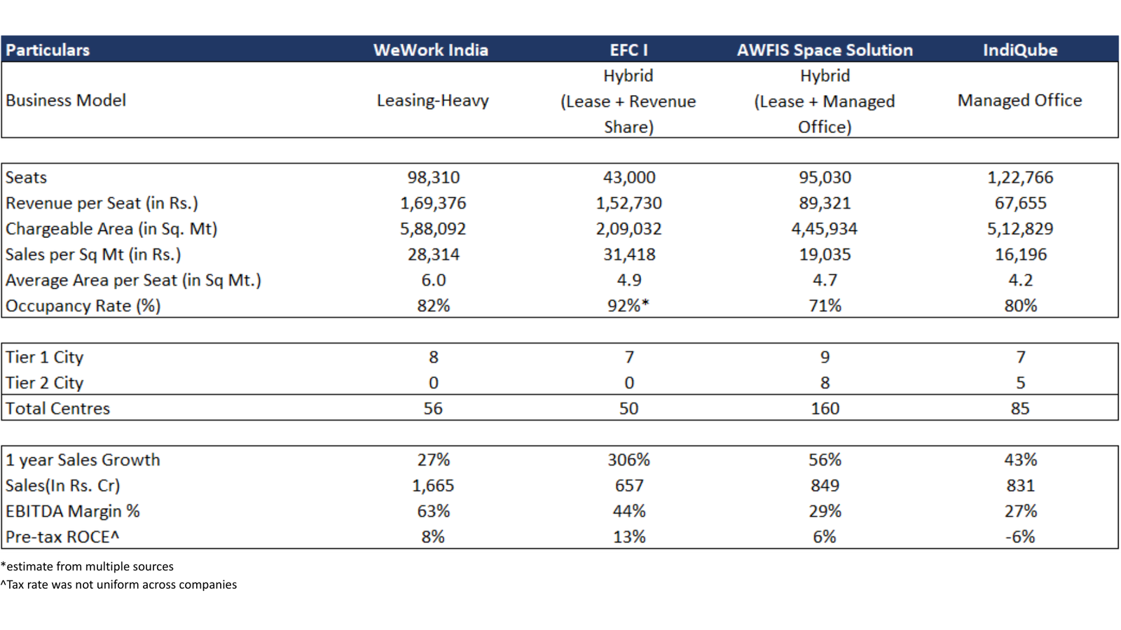 (Source : WeWork India RHP, EFC I, AWFIS Space Solutions, IndiQube, Bastion Research)