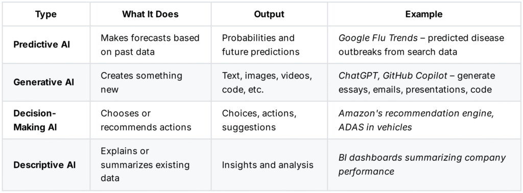 Let’s begin with a bird’s-eye view. Based on the type of output it produces, AI can be grouped into the following FOUR categories. Think of it like different “personalities” of AI, each with its special skillset:
