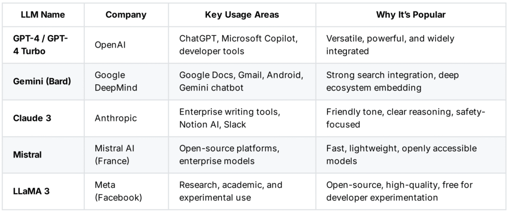 Creating LLMs is still the domain of a few tech giants with the resources to do so. Here are the frontrunners:
