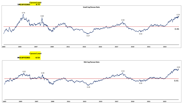 To put things into perspective, the small-cap index, relative to the Sensex, has already surpassed its 2008 levels and is nearing the all-time high of 2005-06. Meanwhile, the mid-cap index, also in relation to the Sensex, is trading at an all-time high. This reflects the market’s growing enthusiasm for smaller companies.